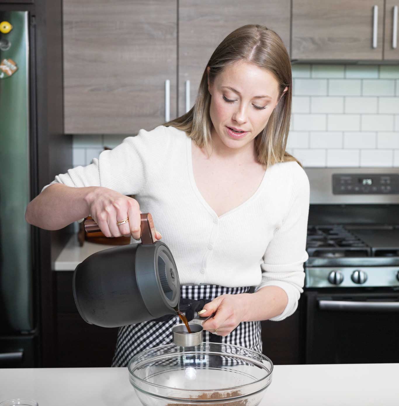 • ⅓ cup (75g) melted ¼ cup (60ml) milk (whole or 2%, room temp)