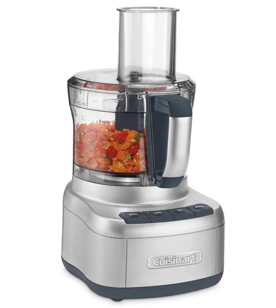 Cuisinart 8 Cup food Processor. This food processor is designed to perform just about any food prep task a recipe calls for. It’s big enough to chop ingredients for a party-sized portion of salsa, and powerful enough to turn a full work bowl of veggies into healthy puréed soups in seconds. Rubberized touch pad controls offer High, Low, Off, and Pulse modes. The stainless steel blade chops, mixes, and kneads effortlessly. The reversible shredding and slicing discs deliver medium or fine shreds and make the food processor a favorite of creative home cooks.